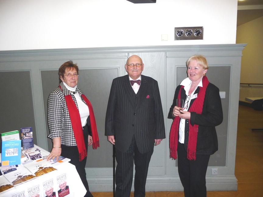 Dr. Ayyub Axel Köhler am Bücherstand des Deutschen Koordinierungsrates, eingerahmt von den Mitarbeiterinnen des DKR, links Monika Blaß, rechts Monika Dahlen.