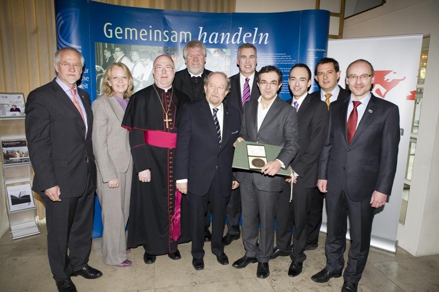 Gruppenbild mit Preisträger (v.l.n.r.): Rudolf W. Sirsch, Generalsekretär des DKR, Ministerpräsidentin Hannelore Kraft, Erzbischof Hans-Josef Becker, Präses Dr. h.c. Alfred Buß, jüdischer Präsident des DKR Landesrabbiner Henry G. Brandt, evangelischer Präsident des DKR Pfr. Ricklef Münnich, Preisträger Navid Kermani, Laudator Sergey Lagodinsky und ganz rechts der Mindener Bürgermeister Michael Buhre
