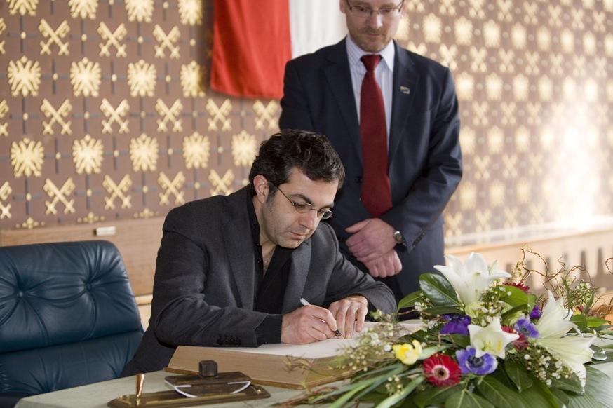 Navid Kermani trägt sich ins Goldene Buch der Stadt Minden ein. Im Hintergrund beobachtet Bürgermeister Buhre den Akt