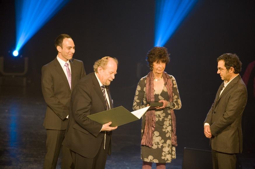 Landesrabbiner Henry Brandt verliest die Urkunde bei der Verleihung der Buber-Rosenzweig-Medaille. Laudator Sergey Lagodinsky (li.), die katholische Präsidentin des DKR, Dr. Eva Schulz-Jander (re.) und Preisträger Navid Kermani (re.) hören aufmerksam zu