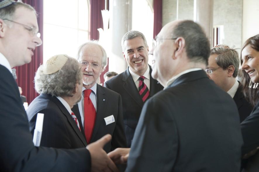 Christlich-jüdische Gesprächsgruppe beim Empfang: Im Vordergrund begrüßen sich Landesrabbiner Jonah Sievers (li.) und Präses Nikolaus Schneider (re.) Im Hintergrund Landesrabbiner Brandt, Genersalsekretär Sirsch, der evangelische Präsident des DKR Ricklef Münnich; rechts am Bildrand die Laudatorin Katrin Göring-Eckardt