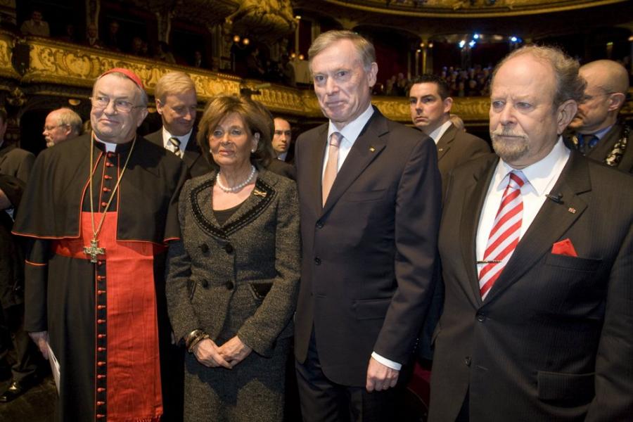 Gruppenbild mit Dame (v.l.n.r.): Der Laudator Kardinal Lehmann, die Präsidentin des Zentralrats der Juden in Deutschland Charlotte Knobloch, Bundespräsident Horst Köhler und der jüdische Präsident des DKR Landesrabbiner Henry G. Brandt
