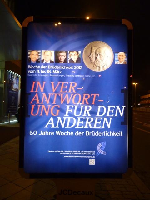 "In Verantwortung für den Anderen. 60 Jahre Woche der Brüderlichkeit" - Das Jahresthema der Gesellschaften und Motto der Woche der Brüderlichkeiten prangte auf großen Plakaten in ganz Leipzig, die - wie hier im Bild - auch nachts hell erleuchtet blieben