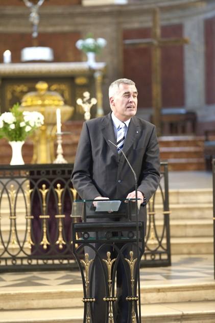 Pfr. Ricklef Münnich, evang. Präsident des DKR, begrüßt die Anwesenden in der Leipziger Nikolaikirche zum Vortrag von Präses Nikolaus Schneider