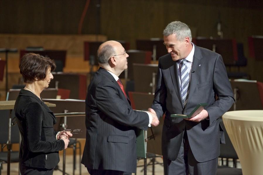 Pfr. Ricklef Münnich, evangelischer Präsident des DKR, begückwünscht Präses Schneider und überreicht ihm die Medaille