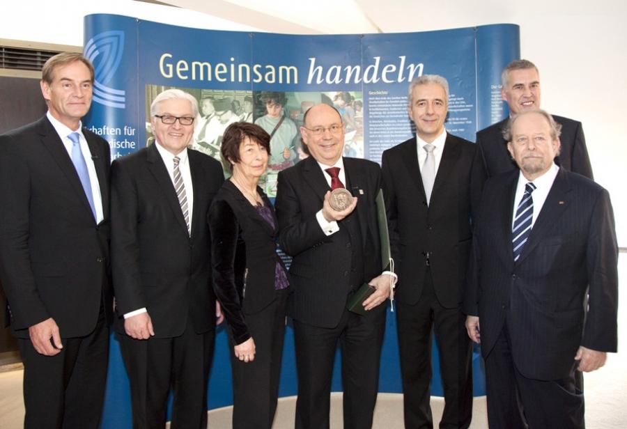 Gruppenbild mit Dame (v.l.n.r.): Oberbürgermeister Burkhard Jung, SPD Fraktionsvorsitzender und Laudator Dr. Frank-Walter Steinmeier, die katholische DKR-Präsidentin Dr. Eva Schulz-Jander, Ministerpräsident Stanislaw Tillich, evangelischer DKR-Präsident Pfr. Ricklef Münnich und vor ihm der jüdische DKR-Präsident Landesrabbiner Henry G. Brandt
