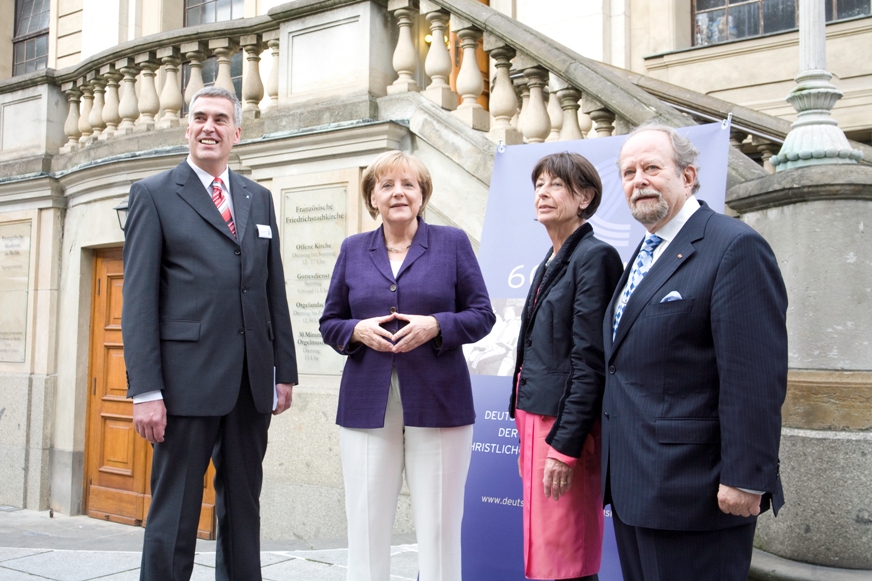 Angela Merkel im Kreise des DKR-Präsidiums (v.l.n.r.:): Ev. Präsident Pfr. Ricklef Münnich, kath. Präsidentin Dr. Eva Schulz-Jander, jüd. Präsident Landesrabbiner Henry G. Brandt