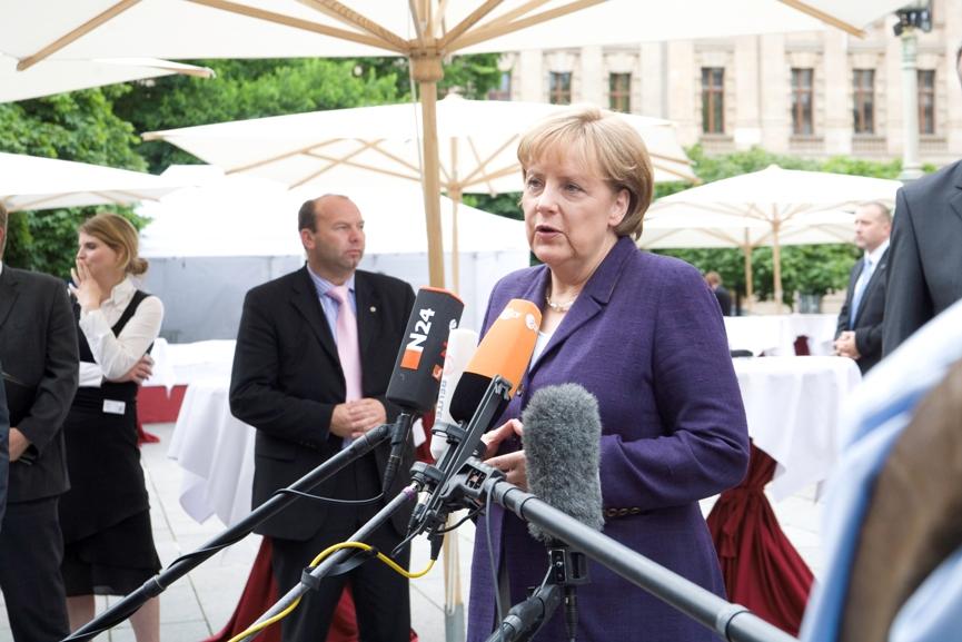 Wo die Bundeskanzlerin auftaucht, ist die Presse nicht weit. Und so muß sie gleich Rede und Antwort stehen, bevor sie den Weg in die Friedrichstadtkirche fortsetzen kann