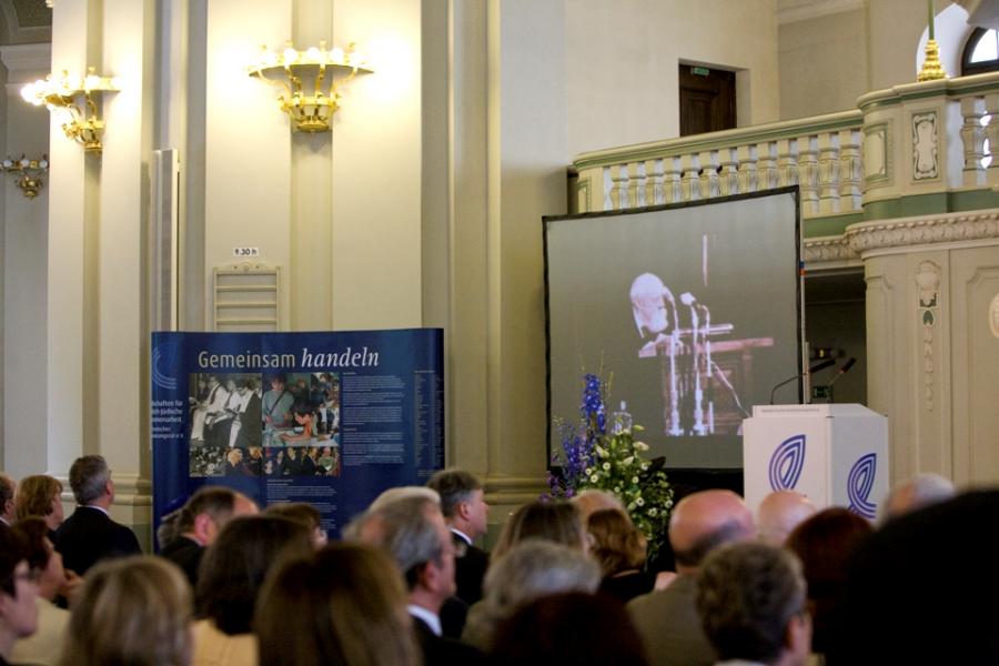 Zu Beginn der Veranstaltung ist über eine große Videoleinwand ein fünfminütiger Trailer über die Arbeit des DKR zu sehen. Auf der Leinwald selbst taucht gerade Martin Buber auf