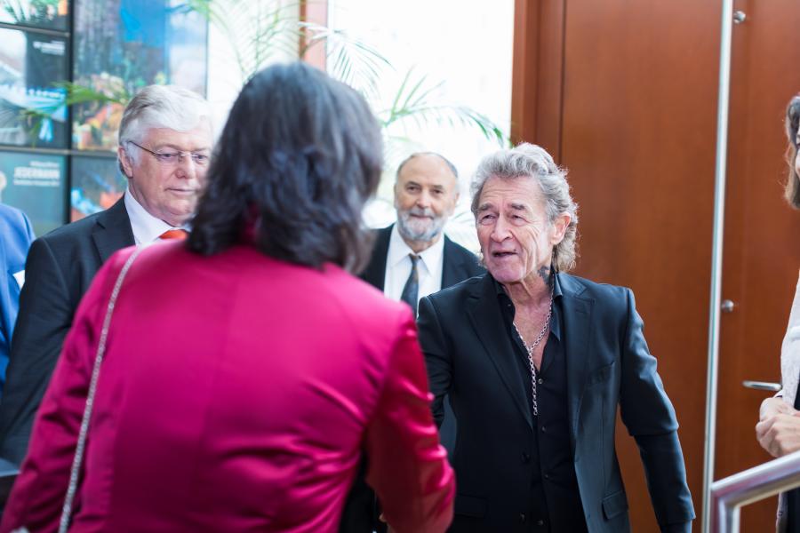 Generalsekretärin Ilona Klemens begrüßt Peter Maffay, Preisträger der Buber-Rosenzweig-Medaille 2018