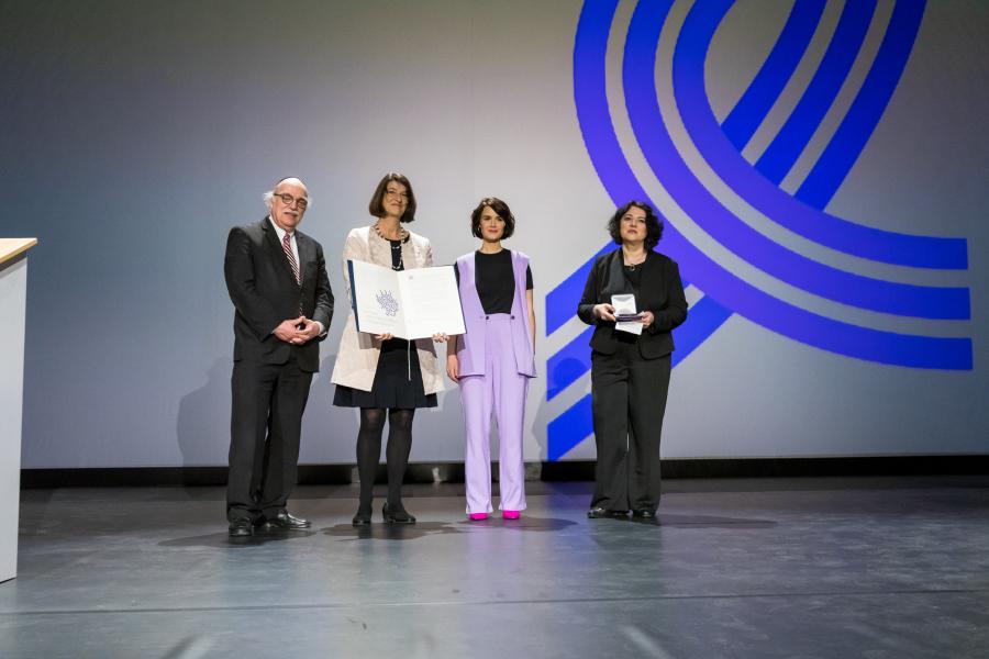 v.l.n.r.: Rabbiner Prof. Dr. Andreas Nachama, jüdischer Präsident des DKR, Dr. Margaretha Hackermeier, katholische Präsidentin des DKR, Moderatorin Yara Hoffmann, Dr. Anja Siegemund, Direktorin der "Stiftung".