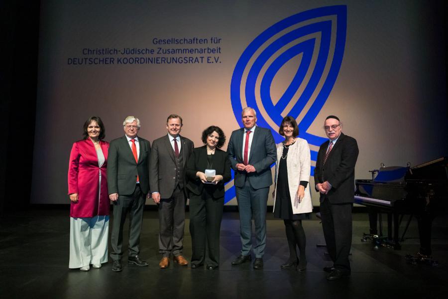 v.l.n.r.: Ilona Klemens, Generalsekretärin des DKR, Friedhelm Pieper, evangelischer Präsident des DKR, Bodo Ramelow, Ministerpräsident des Freistaats Thüringen, Dr. Anja Siegemund, Direktorin der "Stiftung Neue Synagoge Berlin - Centrum Judaicum", Andreas Bausewein, Oberbürgermeister der Landeshauptstadt Erfurt, Dr. Margaretha Hackermeier, katholische Präsidentin des DKR, Rabbiner Prof. Dr. Andreas Nachama, jüdischer Präsident des DKR