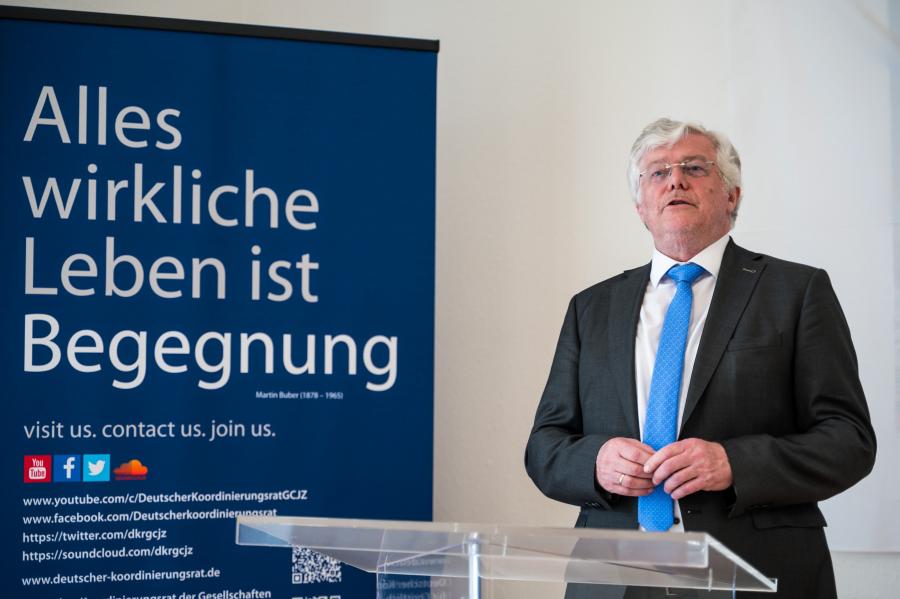 Pfarrer i. R. Friedhelm Pieper, Evangelischer Präsident des Deutschen Koordinierungsrates der Gesellschaften für Christlich-Jüdische Zusammenarbeit begrüßt den Festredner Prof. Dr. Christian Wiese