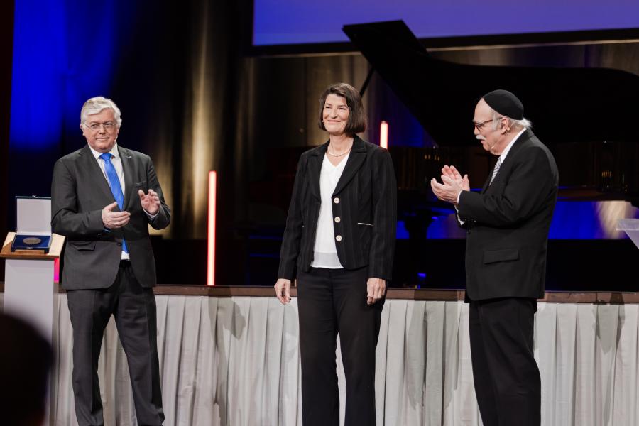 Das Präsidium des Deutschen Koordinierungsrates begrüßt das Publikum und eröffnet den Festakt. V.l.n.r.: Pfr. Friedhelm Pieper (evang. Präsident), Dr. Margaretha Hackermeier (kath. Präsidentin) und Rabbiner Prof. Dr. Andreas Nachama (jüdischer Präsident).