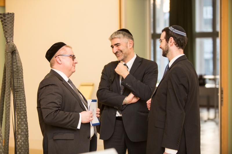 Rabbiner Jona Pawelczyk-Kissin (li.) im Gespräch mit Rabbiner Jaron Engelmayer (re.) und Julien-Chaim Soussan (mi.).