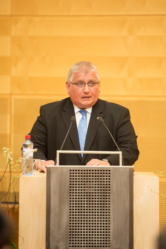 Landtagspräsident Klaus Schlie begrüßt Bischöfe, Rabbiner und Publikum