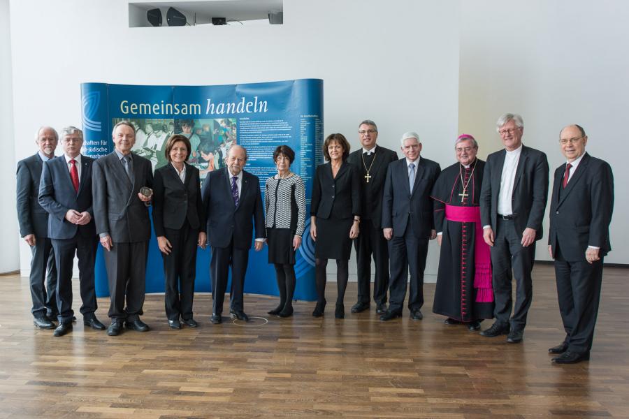 v.l.n.r.: Rudolf Sirsch (Generalsekretär des DKR), Friedhelm Pieper (Ev. Präsident des DKR), Preisträger der Buber-Rosenzweig-Medaille 2015 Prof. Dr. Hanspeter Heinz, Malu Dreyer (Ministerpräsidentin von Rheinland-Pfalz), Landesrabbiner Henry G. Brandt (Jüd. Präsident des DKR), Dr. Eva Schulz-Jander (Kath. Präsidentin des DKR), Dr. Eva Lohse (Oberbürgermeisterin von Ludwigshafen), Kirchenpräsident Christian Schad, Josef Schuster (Präsident des Zentralrats der Juden in Deutschland), Bischof Mussinghoff, Landesbischof Heinrich Bedford-Strohm (Ratsvorsitzender der EKD), Nikolaus Schneider (ehem. Ratsvorsitzender der EKD, Preisträger der Buber-Rosenzweig-Medaille 2012)